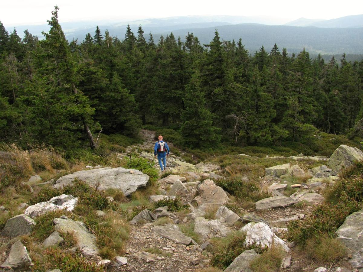 David získává nějakých 100 – 200 m náskok, tak ho musím stíhat. Ale v hlavě se trochu krotím, abych ještě před cílem nevytuhl a uklidňuju se, že jsem pátý, o čemž se mi ani nesnilo a můžu být naprosto spokojený. Jak se vyškrábu na Vysokou Holi, začnu se ohlížet jestli mám někoho v patách. Nikde nikdo, David pořád stejně daleko přede mnou, tak si konečně odskočím na malou. Chtělo se mi už někde od Červenohorského sedla. Nahoře fouká trochu silnější studený vítr, je hodně zamračeno, jako by chtělo pršet, ale naštěstí nezaprší. Co se týče počasí, byl to asi nejhorší úsek. Běžecky je to ale úsek příjemný. Vyšlapaný turistický chodníček, skoro po rovince. To mi ovšem nebrání zase asi 3x zakopnout. Naštěstí nic vážného, jenom kleknu na všechny čtyři, zakleju, zvednu se a pokračuju. Na Jelení studánce je možnost se napít pramenité vody, tak jí naposled využívám. Kontroluju čas a odhaduju cílový čas na 3:45. David si udržuje pořád asi 100 m náskok. Ještě kousek se běží po rovince, než doběhneme ke Ztraceným kamenům. Odtud už jen dolů až téměř do cíle. Sestup začíná drsně.
